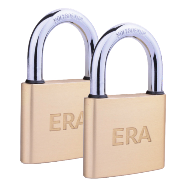ERA Solid Body Brass Padlocks with Anti Bump, Pick and Dill resistance, available in 20mm, 40mm, 50mm and 60mm body widths. These ERA Brass padlocks have some great security and weather protection features, the shackle is sealed for protection against the weather and 40mm version and above have a double lever locking mechanism. ERA Brass Body padlocks have a long shackle 40mm version and also a 40mm keyed alike twin pack, these padlocks really are great value for money.