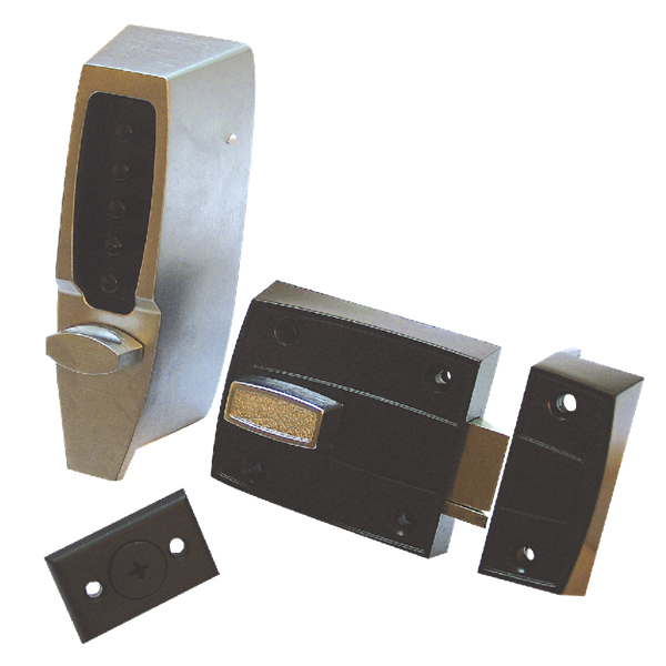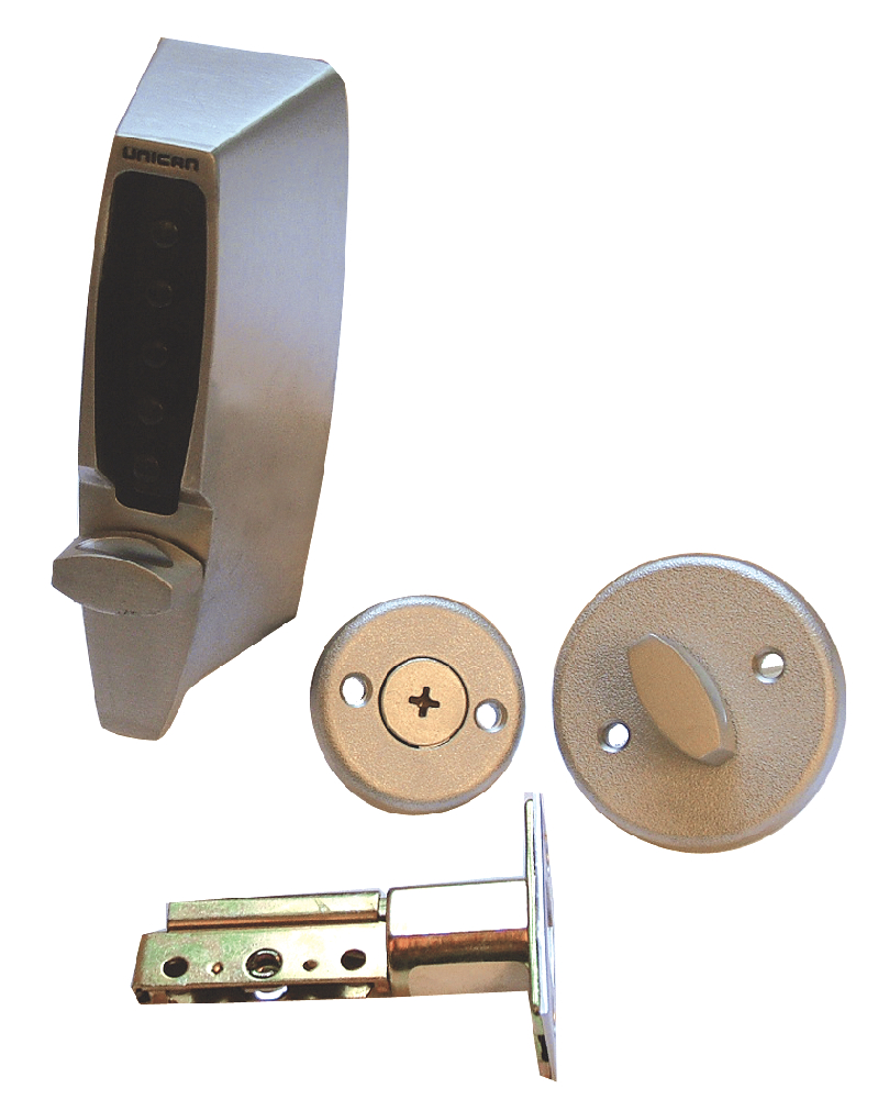KABA Simplex 7100 Series push button small digital door lock with optional locking bolts. The 7100 from KABA can be supplied with either a tubular deadbolt, deadlocking latch or deadlocking rim latch. All latch types apart from tubular deadbolt will automatically relock when door is closed, tubular deadbolt requires a manual lock.