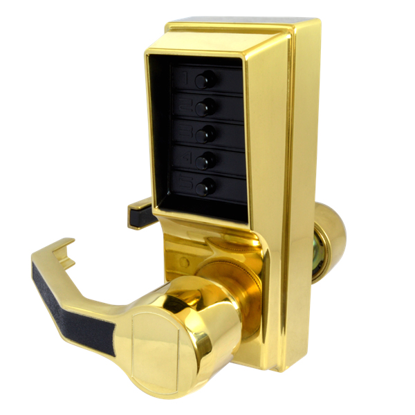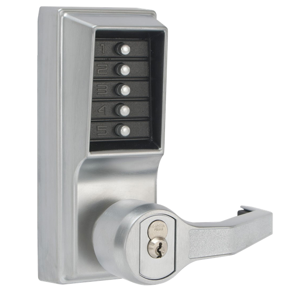 KABA Simplex L1000 series combination door lock with full size lever handles for easy operation. The L1000 can be supplied in many formats to suite door requirements with features such as emergency exit panic bar, key override and passage function.