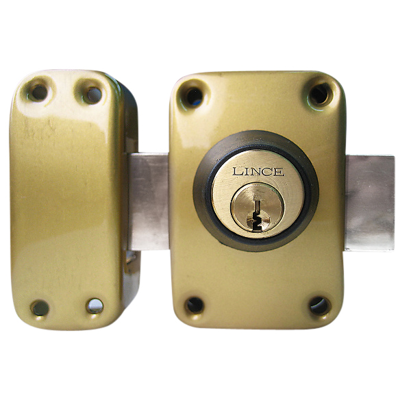 From Lince we have their 3916-HEF Rim Deadlock that is ideal for outside garden gates. This Gold Coloured lock has key access from both sides, this stops someone passing their hand through or around the gate to gain entry. Each Lince 3916 is suplied with 3 keys, extra keys can be supplied if required and can be fitted to gates and doors of up to 50mm thick. The Lince 3916 really is a great lock for outside gates and doors made of metal or wood and can be fitted to left and right hand doors.