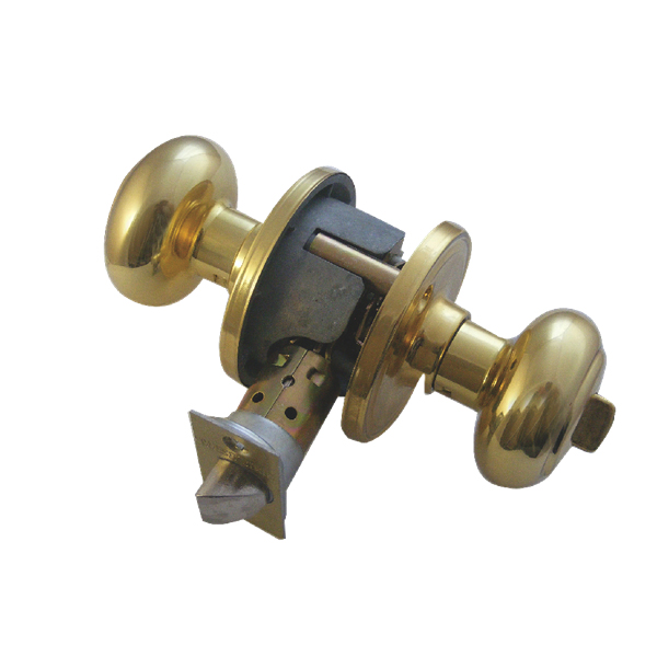 Both knob operate latch, thumb turn to lock from inside with emergency release on outside.